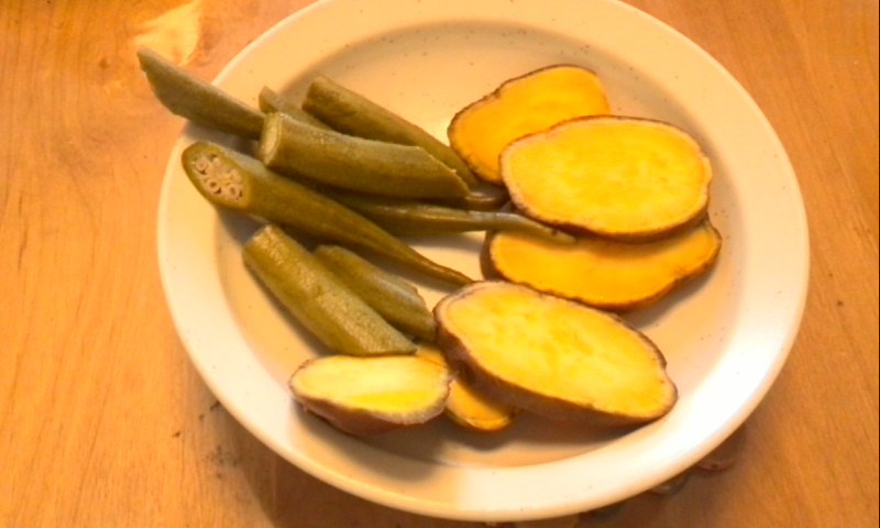 家にあったもので加熱調理できそうなものがあまりなく、ひとまずサツマイモとオクラを選びました。