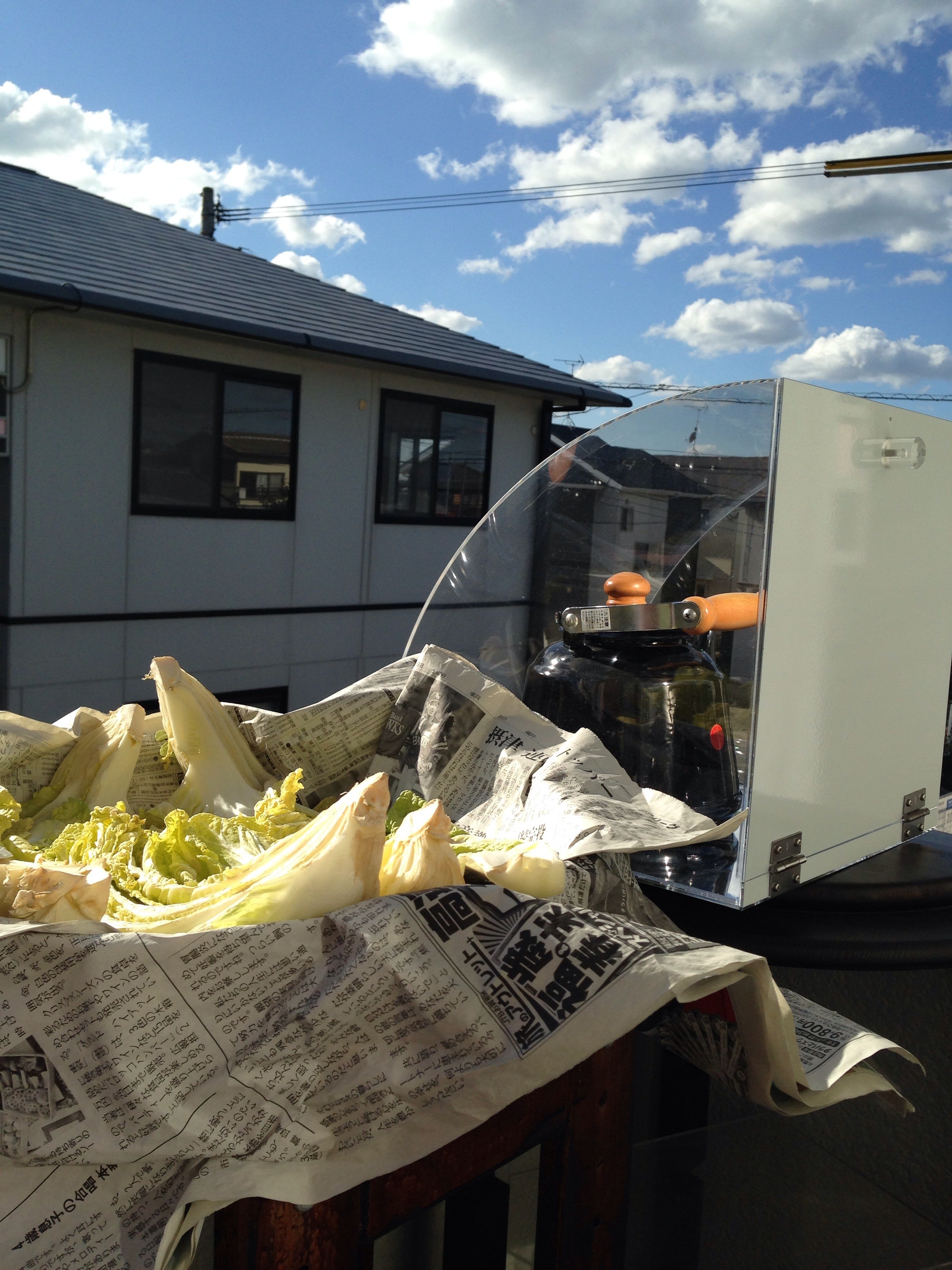 冬場はぬくみちゃんの活躍の機会が少なくて残念なところだけど、今日はいい感じに温まってくれそうなので、夕食に活かせそうです! そして、ぬくみちゃんの隣には・・・白菜!! 温水箱用の台が思わぬところで活躍しています(笑)