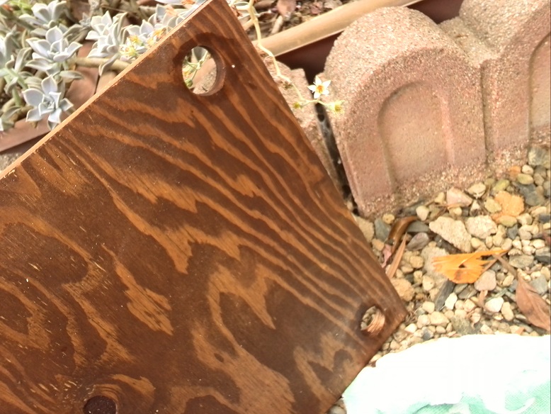 構造用合板は屋根瓦などを葺くときの下地板にも使うために、湿気を受けても痛みにくいようになっています。薄く削いだ板を重ねたもので、木材のように割れることはありません。これに屋外用塗装を施せば、そこそこ耐久性のあるものになるかもしれません。