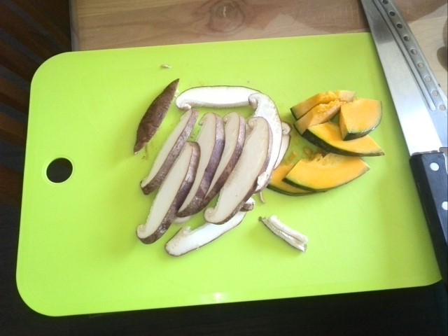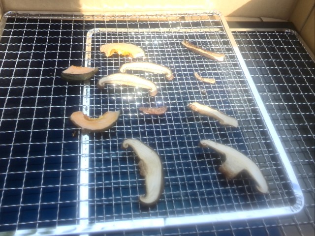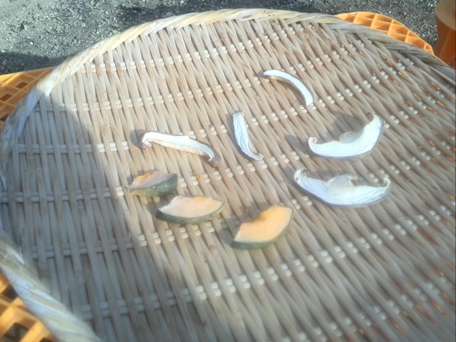 17:00頃まで干して、いずれもシイタケはそれなりに干せて、若干しっとり感は残るもののとても香りが強くなりました。カボチャはまだ芯は生だと思いますが表面はそこそこ乾いています。