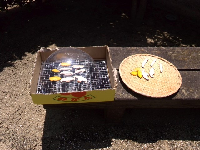 時々干し具合を確認しました。極端な違いはありませんが若干簡易ソーラーフードドライヤーで作ったものが乾燥が早かったように思います。