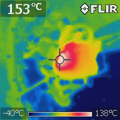 サーモグラフィでは、やかんがしっかり加熱していることがわかります。一部が150℃を超えていました。