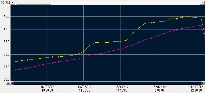 一方バット内はなだらかな水温の上昇を見せました。湯槽・バット内の温度差は凡そ3℃程度です。最終的には40℃超えとなり、天気が悪い割に温度が上がりました。