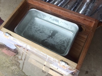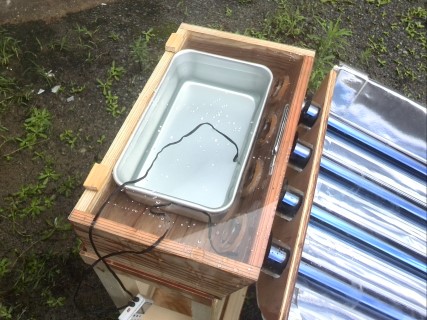 太陽熱温水器に使われている真空断熱ガラス管を並べて、その上にお湯の槽があって、槽内にアルミのバットを入れてあります。