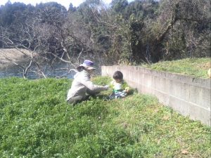まずは田んぼの畦に生えているノビルを採取しつつ草むらを楽しんだり。