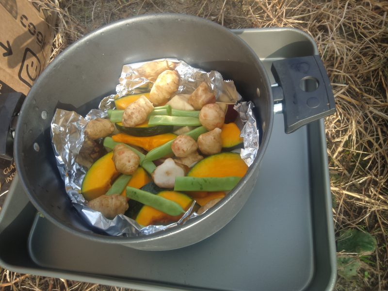 太陽が弱くて野菜はあまり煮えませんでしたので、ダッチオーブンの肉上にそのまま載せて再加熱。