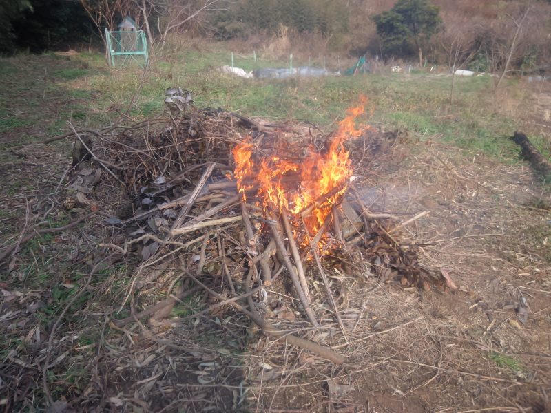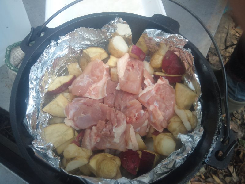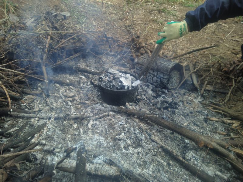 久しぶりにダッチオーブンも使います。刈って転がしておいた雑木でたき火をしまして、