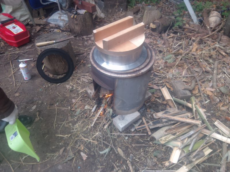 たき火が熾火になったのでそこに据えて、上と周りに炭を載せました。