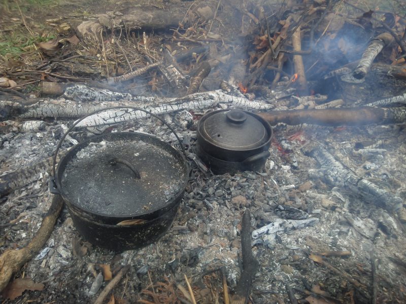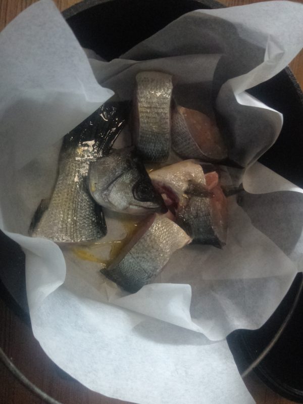 スズキはダッチオーブンに。土鍋は米炊き用です。