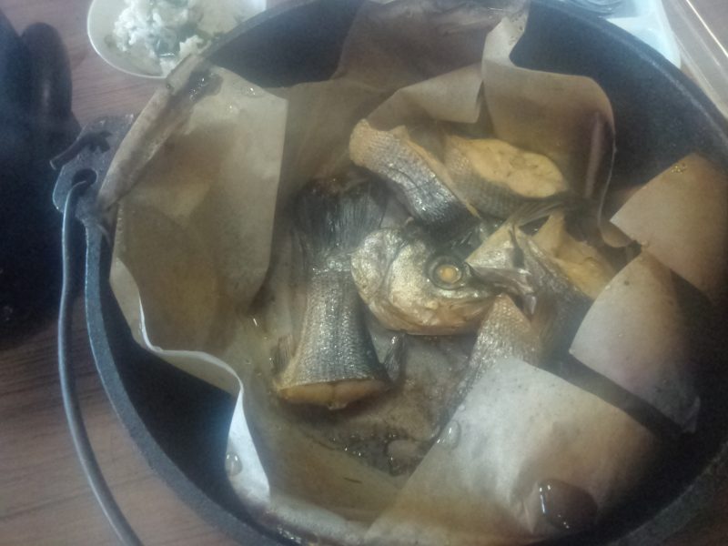 さて山に戻りまして、魚の調理の様子を見ましたら、焚火を鎮火して予熱で保温したつもりが結構冷めてしまっていました。