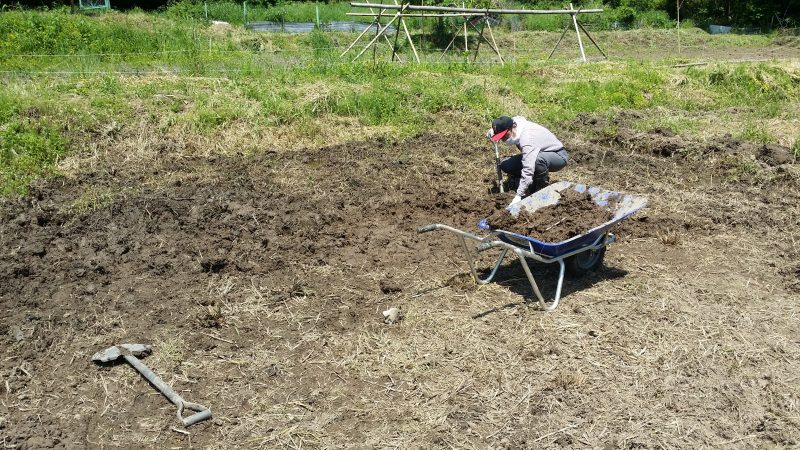 友人1名に手伝いに来てもらいました。先のエリアを15cm程度掘って運び出し、その土で畔を作ります。