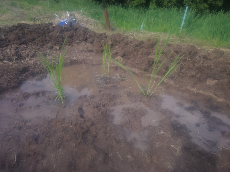 マコモは稲よりも水深を深くした方が良いらしく、栽培エリアを掘って畔を盛ることで30cmくらいの水深を目指します。