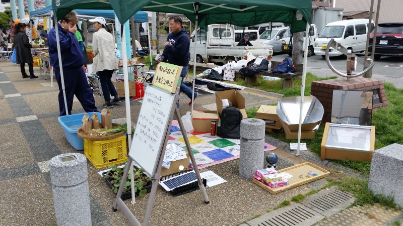 ぬくみねっとは、手光えこびれっじで採取したノビル・ユキノシタの苗・栽培した米・花蓮の芽など農産物・野草と、ソーラークッカー・小型ソーラーシステム・ソーラーおもちゃなどを持参。