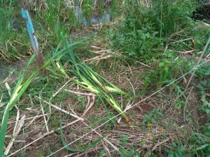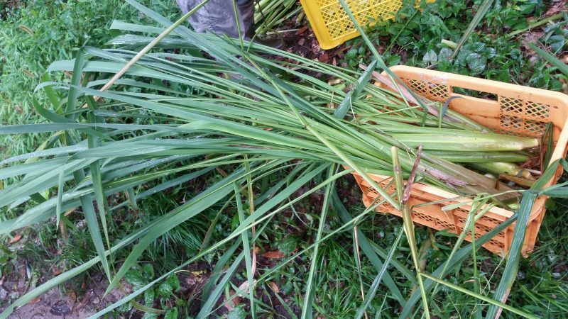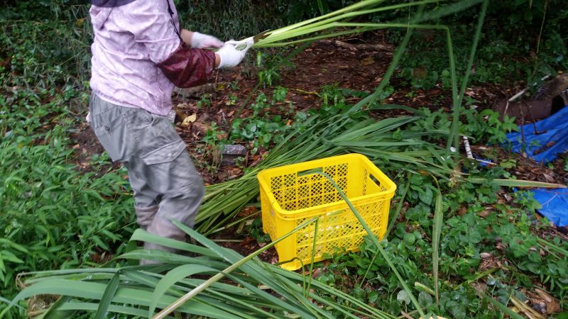 この日は台風が九州北岸に迫っているということで、風もじわじわと強くなっていきパラパラと雨も降りだしてきているので作業開始は明日かなと思っていましたが、マコモの葉をご入用の方が本日で構わないということでしたので手光の山に向かいました。
