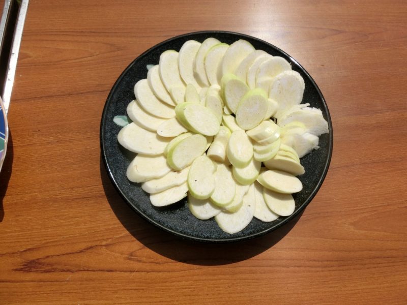 マコモダケは、新鮮なので生のスライスで。そのままか、塩・醤油でいただきます。