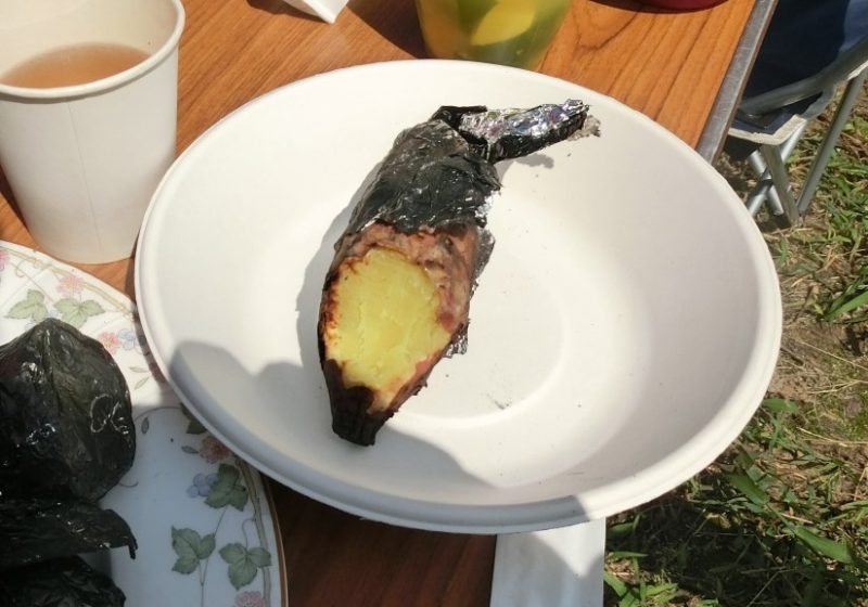 サツマイモも、かまどの火に投げ込んで焼き芋にしました。